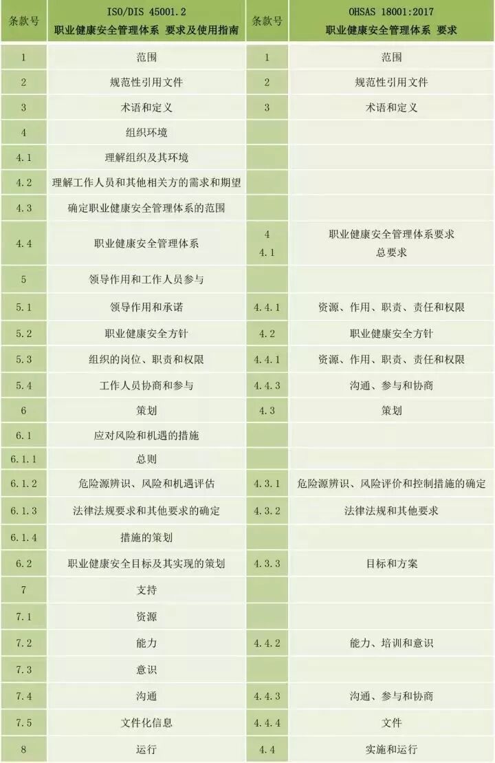 —— OHSA18001已经成为过去式,2016年10月,国际标准化组织正式发布了ISO45001职业健康安全管理体系,意味着职业健康安全管理体系正式纳入了ISO标准之中,将给大家展现一个全新的职业健康安全管理系统。 01 职业健康安全管理体系发展历程 职业健康安全管理体系是在20世纪80年代后期兴起的,当时一些跨国公司和大型现代化联合企业,为强化自己的社会关注力和控制损失的需要,开始建立自律性的职业健康与环境保护的管理制度。 1996年,英国颁布了《职业健康安全管理体系指南》(BS8800); 在1999年,英国标准协会(BSI)、挪威船级社(DNV)等13个组织提出了职业健康安全评价系列(OHSAS)标准,即OHSAS 18001《职业健康安全管理体系——规范》和OHSAS 18002《职业健康安全管理体系——OHSAS 18001实施指南》。 直到2013年,国际标准化组织(ISO)开始编制一项新的标准——ISO 45001《职业健康安全管理体系 要求及使用指南》,用于取代OHSAS 18001标准。 02 为什么要将OHSAS 18001转化成ISO标准? 全球通用 更权威 更易整合 更易管理 首先,根据调查,目前大约有45个国家利用OHSAS 18001标准架构管理其职安卫(职业健康管理、安全管理、卫生管理简称)系统。虽然应用范围很广,但并非全球通用,而转化成ISO标准,仅其会员就有近70个国家,使其应用范围得到仅一步扩大。同时,ISO标准是全球认可的标准,不仅使其应用范围进一步扩大,另外使其更具有权威性。 其次,ISO拥有国际性的专业知识。通过ISO成员组织,有近70个国家参与方或者观察员的方式参与到ISO 45001的发展中来。 第三,现在许多组织都在使用ISO管理体系标准,这将更加使其与其他职业健康安全标准的整合更加容易。同时,对于许多小企业或许只有一个人员在管理安全以及环境方面的事宜,所以委员会也更加关注与ISO 14001相整合的可能性。 03 ISO 45001与OHSAS 18001的区别 ISO 45001的构建是在OHSAS 18001已有的规范上,其主要目标是相同的,都是为提高组织的职业健康安全绩效。同时,通过以下表1框架的对比,也存如下不同之处: 使用了ISO管理体系的高级结构 更加关注“组织环境” 强调最高管理者的职责和领导作用 更加关注于管理职责 强调了基于风险的思维 更加关注于绩效的监视与测量 表1 ISO 45001.2与OHSAS 18001:2007的对应关系 在新标准中,一个组织将不仅仅专注于其直接的健康和安全问题,而是会考虑到更大的社会期许。组织需要考虑到他们的分包商和供应商,还有比如说他们自身的工作会在周围对相邻的邻居造成怎样的影响。这会比仅仅关注与内部员工的条件更加广泛,意味着组织不能仅仅将其风险通过外包“嫁接”出去。 ISO 45001强调,这些职业健康和安全因素体现在组织的整个管理体系中,需要从管理和领导层获得更高程度的认可。这对于那些目前习惯于将责任授权给一个安全经理而不是完全地融合入组织的运行中的使用者来说,将是一个很大的变化。ISO 45001要求职业健康和安全因素是组织完整管理体系中不可分割的一部分,而不再只是附加的部分。 标准要求组织在策划职业健康安全体系时,应确定组织所需要应对的风险和机遇。风险和机遇存在于组织的危险源、合规性,以及所处的环境和相关方需求和期望中。标准要求组织要采取应对风险和机遇的措施,以确保体系能够实现组织的预期结果,实现组织在职业健康安全方面的持续改进。 04 ISO 9001、ISO 14001、ISO 45001的相同点和不同点 ISO实施三个标准最大的不同点是其对象不同: · 组织按ISO 9001标准建立的质量管理体系,其对象是顾客。 · 组织按ISO 14001标准建立的环境管理体系,其对象是社会和相关方。 ·组织按OHSAS 18001标准建立的职业安全健康管理体系,其对象是员工。 ISO实施三个标准的相同点: ·组织实施管理的总方针和目标相同。 ·三项标准使用共同的过程模式结构,结构相似以方便使用。 ·体系的原理都是PDCA(计划-执行-检查-改进)循环。 ·都需要有文化的管理体系。 ·都明确要有文件化的职责分工。 ·都提出了通过体系运行实现持续改进。 ·都提出了遵守法规和其他要求的承诺。 ·都提出用内部审核和管理评审来评价体系运行的有效性、适宜性和符合性。 ·都要求对不符合项进行管理评审并加强培训教育。 ·都要求组织的最高管理者任命管理者代表,负责建立、保持和实施管理体系。 05 ISO 9001、ISO 14001、ISO 45001框架整合 在国内,组织都是将各个管理体系进行整合,质量、环境、职业健康安全管理体系作为ISO标准,均使用了高阶结构,为体系的整合提供了便利。表2将三个体系的框架进行了对应于合并,可供读者参考。 表2 ISO 9001、ISO 14001、ISO 45001框架整合 06 组织保持健康和安全的5步法 组织可通过以下五步,使其工作人员在工作过程中保持健康和安全: 第一步,识别工作场所的所有过程和活动; 第二步,在工作人员的帮助下,检查是否某些活动中有可能造成伤害的重大危险源。比如注意一些危险情况/过程,包括高处工作、机械、电气设备、化学品、建筑活动和农场工作等等。 第三步,降低可能导致严重损伤(事故或长期病痛)的风险,可通过消除危险源、变更工作流程、保护工作人员等方式。例如:长期接触重物、辐射、噪音、振动、视觉显示屏、化学品等。 第四步,验证保护工作人员而采取的措施是否正常运行,这些规定是否在遵守。 第五步,通过寻找如何做得更好、更安全