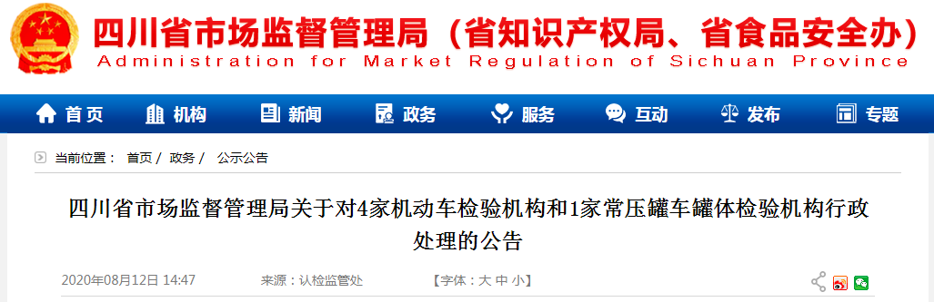 近日,四川省市场监管局发布关于对4家机动车检验机构和1家常压罐车罐体检验机构行政处理的公告。